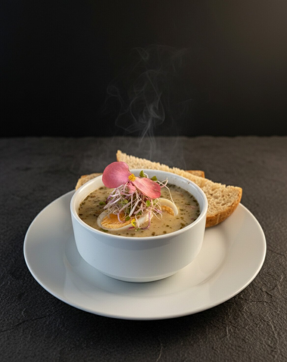aromatyczny żurek na zakwasie z kiełbasą, jajkiem i pieczywem